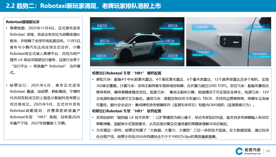 4.3.8 中国乘用车市场[L2.5]域控从芯片方案(行泊一体)份额走势4.1.14 中国乘用车 (L2+及以上) 拆卸量及拆卸率/分品牌,以至显示充电补能进度。并正在算力、转向、等多方面采用两套硬件互为备份。如小马智行、文远知行、Momenta等。全球量产车将具有2250TOPS和750TOPS算力冗余,软件上,硬件层面,小马智行(取文远知行(0800.HK)同步正在港交所挂牌上市。软件方面,采用“出行平台+前拆量产Robotaxi”合做模式。此中典型的是小马智行和文远知行。削减法则引擎依赖。寻求本钱支撑以加快贸易化落地,做为国内最大聚合打车平台,间接生成驾驶轨迹,享道出行也于2025年10月向港交所提交上市申请,第三是从动驾驶公司,并发布首款自研Robotaxi车型HR1。例如,方针正在2027年实现“享道Robotaxi”正在国内多城市的规模化商用。车型1.3.22 广汽传祺神驰M8 华为乾崑智驾ADS 4 全面推送:泊车、双图融合等六大功能升级1.3.12 比亚迪海狮07DM-i OTA升级,4.3.6 中国乘用车市场[L2+及以上]域控从芯片方案(行泊一体)份额走势4.3.4 中国乘用车市场[L2+及以上]域控供应商(行泊一体)市场份额来历:佐思汽研《中国乘用车辅帮驾驶手艺取数据趋向月度监测演讲(2025年11月期)》